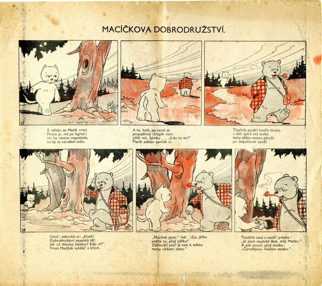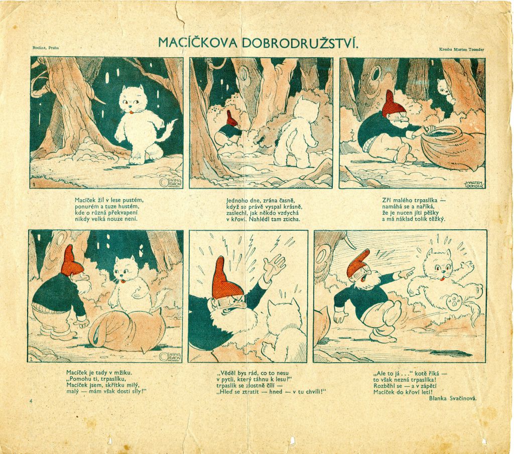In het archief van Marten Toonder in het Literatuurmuseum bevindt zich een groot aantal uit buitenlandse dag- en weekbladen geknipte afleveringen van de ‘Avonturen van Tom Poes’. Met name het Scandinavisch taalgebied is goed vertegenwoordigd. De knipsels dateren allemaal van na de oorlog, op één uitzondering na: een mapje met uit een Tsjechisch kindertijdschrift geknipte bladzijden met afleveringen van ‘Macíčkova dobrodružství’ (‘De avonturen van Macíčkova’).