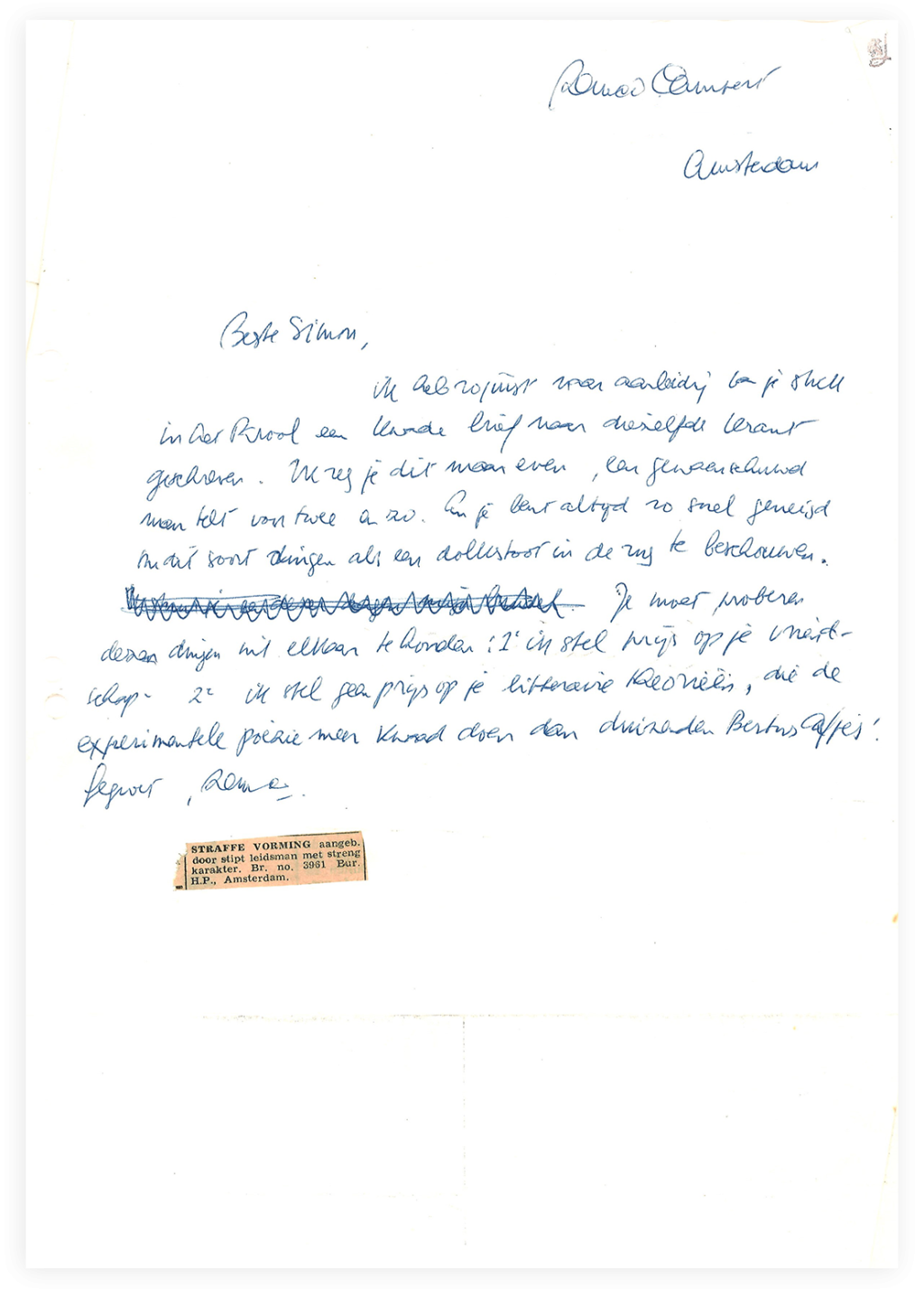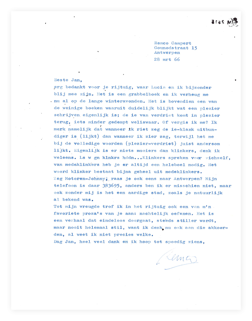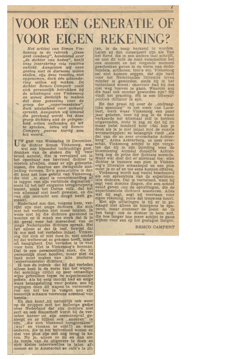 En ook melancholie, omdat de mededeling het einde markeert van een schrijverschap dat de eeuwige jeugd leek te hebben. In de artikelen die over Campert verschenen in de dagen na zijn overlijden, wordt terecht de nadruk gelegd op zijn vitaliteit en het speelse karakter van zijn werk. Tussen de veelal nogal serieuze Vijftigers – want dat was de stroming waarbij Campert zijn eerste aansluiting vond – was hij de vrolijkste, misschien samen met Jan Hanlo, die ook altijd aandacht voor het onooglijke had (maar die geen échte Vijftiger was). Er is één brief van Campert aan Hanlo bewaard gebleven, die hij stuurde nadat hij Hanlo’s bundel met prozastukken had ontvangen (In een gewoon rijtuig, 1966). Hij reageert met een sympathieke, inlevende brief waarin hij Hanlo’s oog voor detail niet alleen deelt, maar zich ook helemaal in diens manier van denken inleeft.