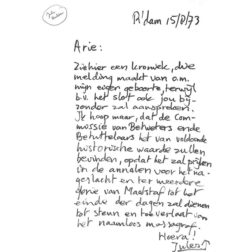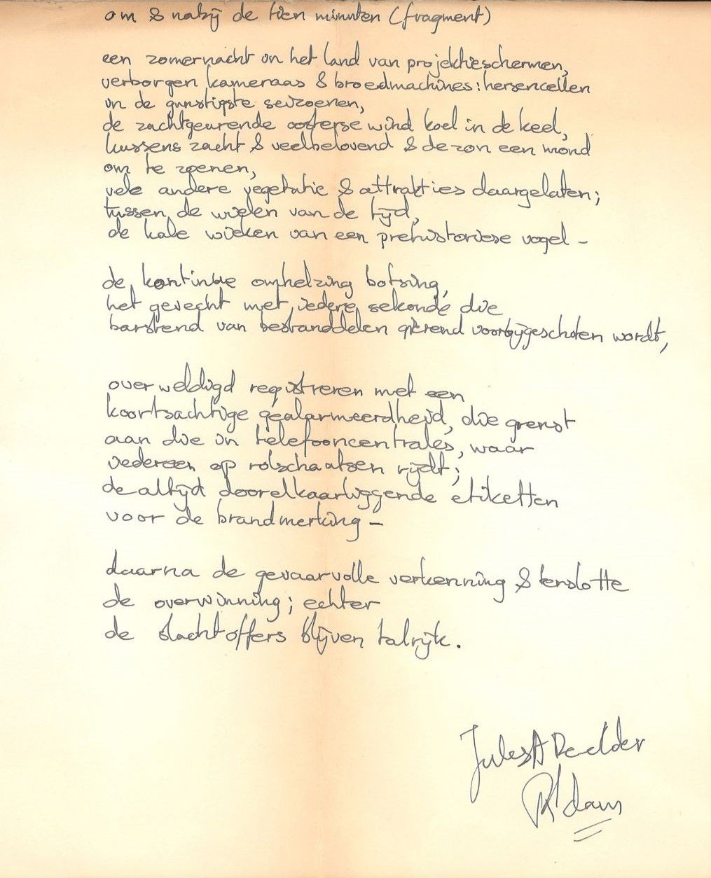 Toch ligt hier nu een handschrift voor me van ‘Jules A. Deelder, R’dam’, ongedateerd. Het is een ‘fragment’ van een gedicht dat ‘om & nabij de tien minuten’ heet. En het roept een hoop vragen op. Om te beginnen: er is geen gedicht van Deelder bekend dat ‘om & nabij de tien minuten’ heet. En dit ‘fragment’ keert ook in geen ander mij bekend gedicht van Deelder terug. Het staat in elk geval in geen van de gepubliceerde bundels. Een onbekend Deelder-gedicht, dat kan natuurlijk, sterker nog: dat is mooi nieuws! Maar veel houvast krijgen we niet. Ik heb eigenlijk alleen de tekst: