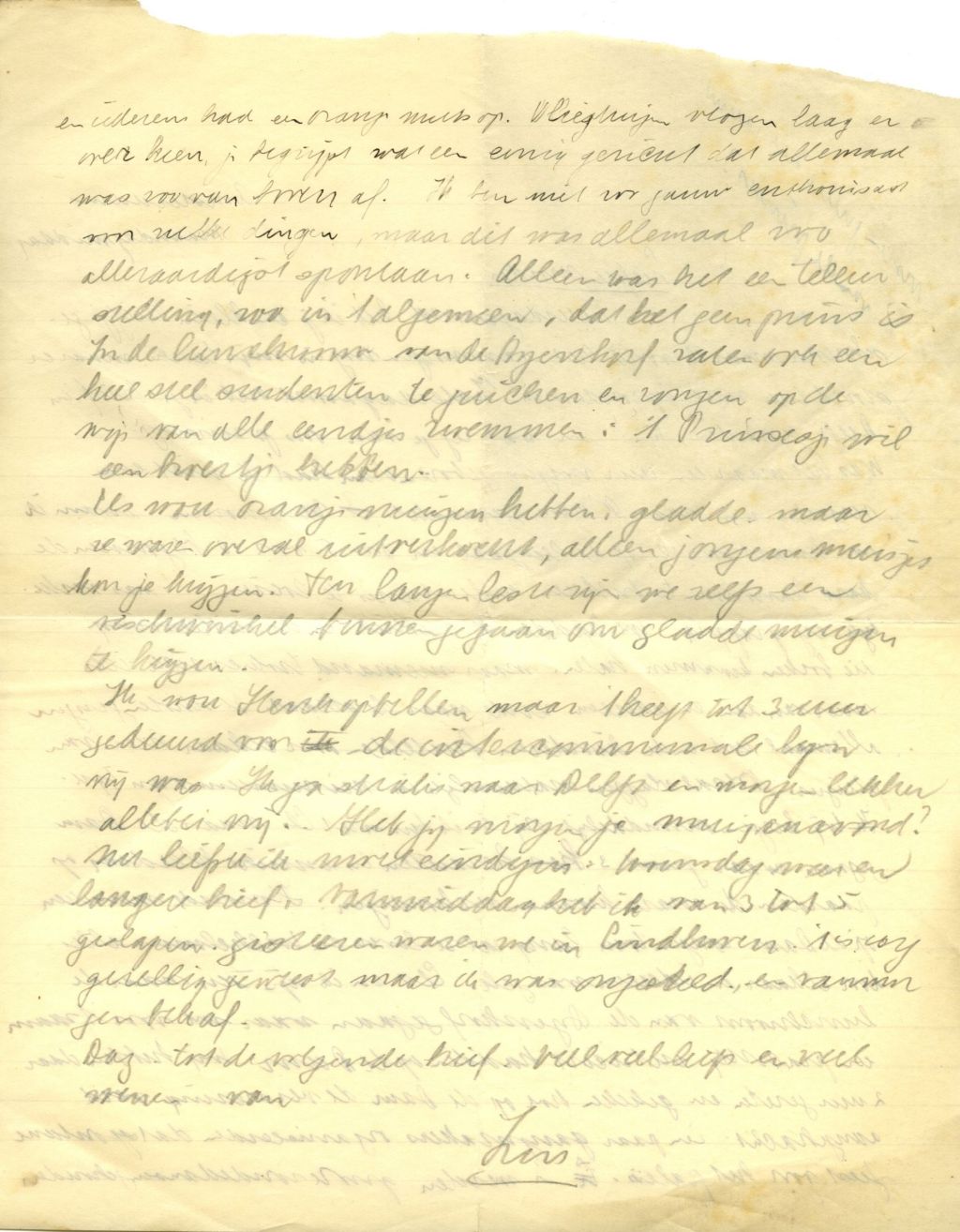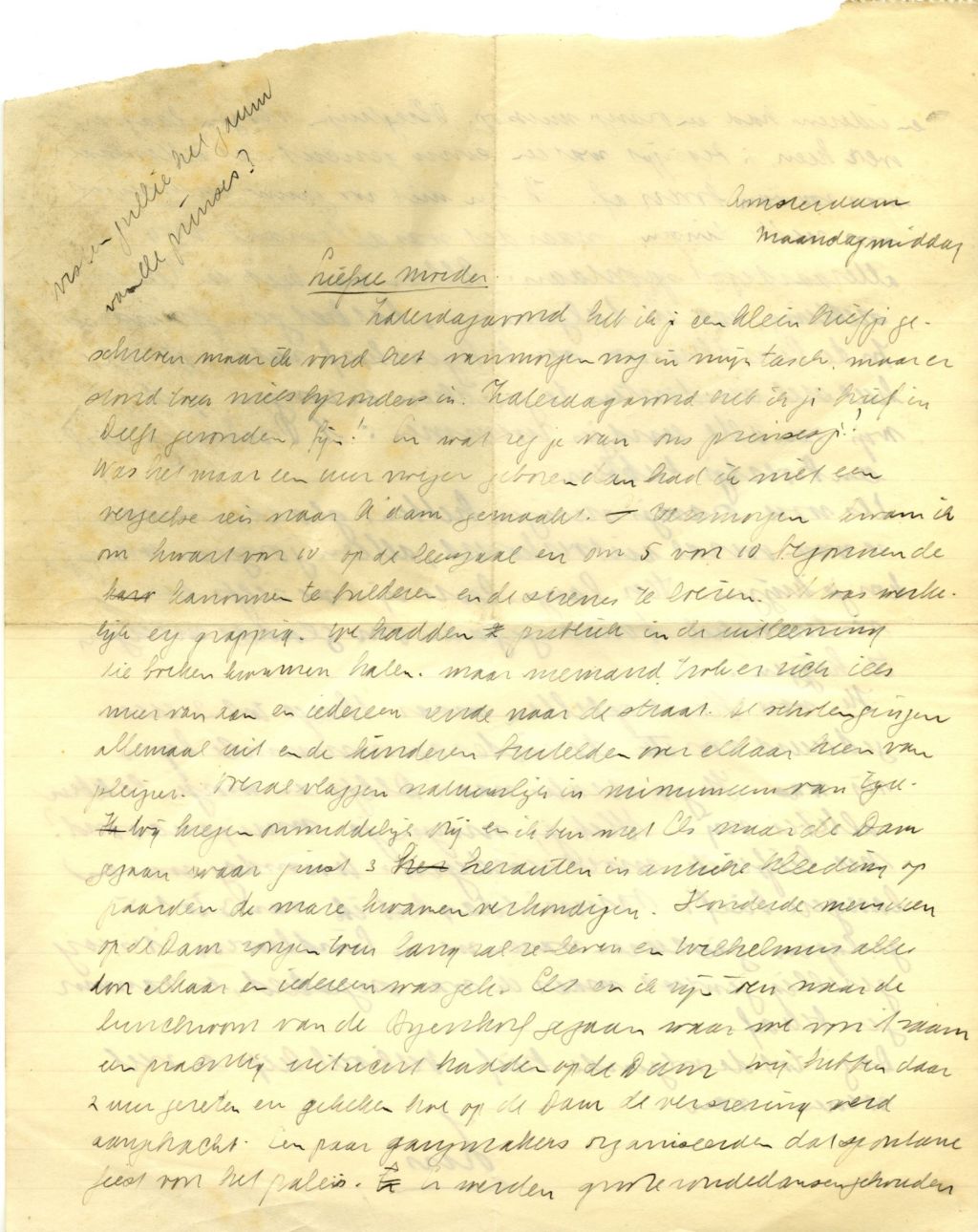 De scholen gingen allemaal uit en de kinderen buitelden over elkaar heen van plezier. Overal vlaggen natuurlijk in minimum van tijd. Wij kregen onmiddellijk vrij en ik ben met Els naar de Dam gegaan waar juist 3 herauten in antieke kleding op paarden de mare kwamen verkondigen. Honderden menschen op de Dam zongen toen lang zal ze leven en Wilhelmus alles door elkaar en iedereen was gek.