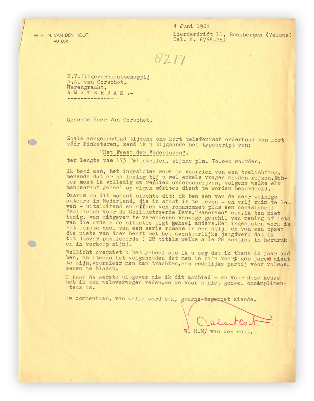 Wat moet iemand die kan leven van feuilletons voor de Panorama en jeugdboeken die hij schrijft onder pseudoniem bij uitgeverij G.A. van Oorschot? Op 4 juni 1960 probeert een zekere W.H.M. van den Hout de respectabele uitgever geïnteresseerd te krijgen voor zijn werk. Hij stuurt het typoscript van een roman met de titel Het Feest der Vaderlozen naar Amsterdam, en stelt zichzelf zonder valse bescheidenheid voor.