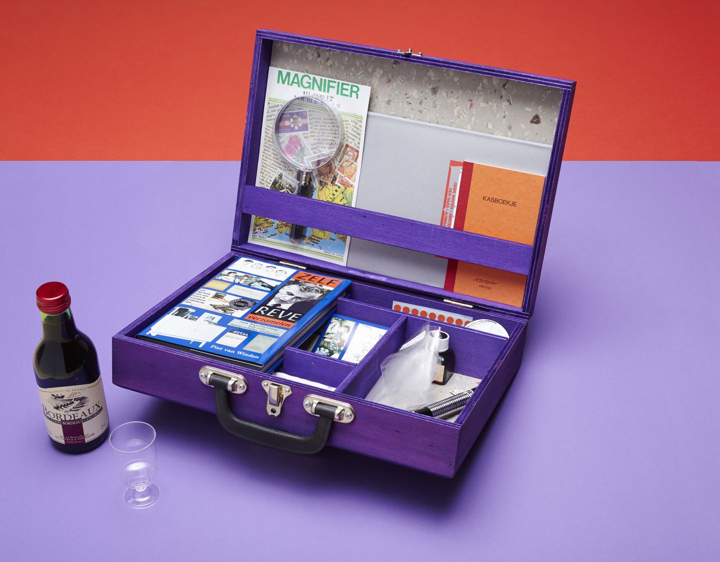 De inhoud ervan was even opmerkelijk als banaal: rode stickers, plastic handschoenen, een zakatlas en -lantaarn, een button (‘Leve Reve!’), een loep, een flesje bordeaux, een wijnglas, een kroontjespen met houder, een balpen, inkt, een schrift, een kasboekje, een theezakje, en een ‘ijkvel origineel kladhandschrift’ van de meester zelf. Dit alles werd gepresenteerd onder het motto Zelf Reve Verzamelen. Handleiding tot een fatsoenlijke collectie. Eén van die vijftig exemplaren kon ik tot mijn vreugde inkijken in het Literatuurmuseum in Den Haag. De hobbykoffer waarin het pakket zat, was jammer genoeg niet uitgevoerd in violet (zoals de ware reviaan zou verwachten), maar wel in paars, wat toch al in de buurt kwam. Ongetwijfeld was ook dat geen toeval, want paars is in de katholieke liturgie de kleur van de penitentie.