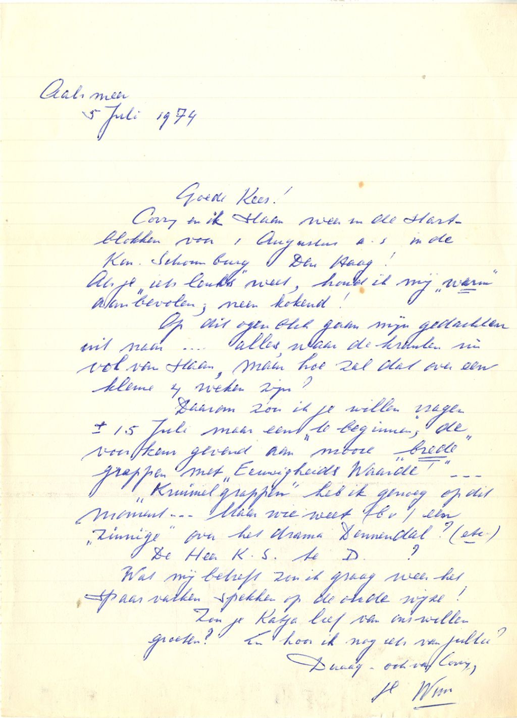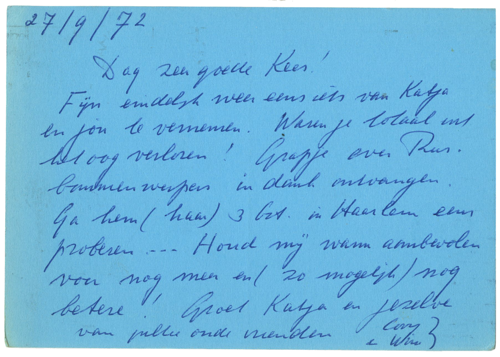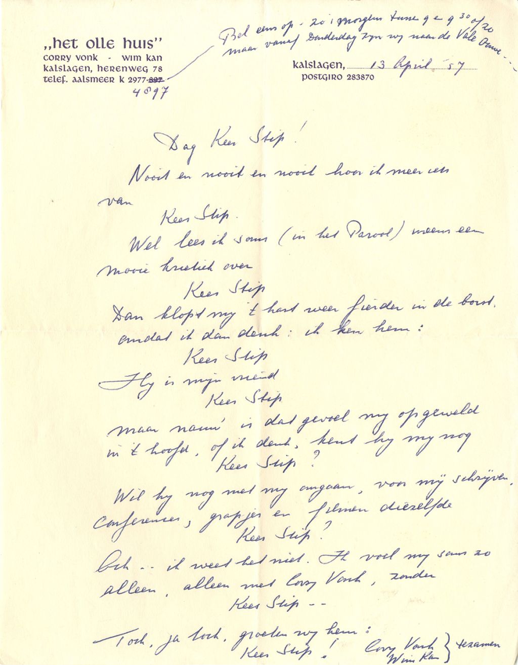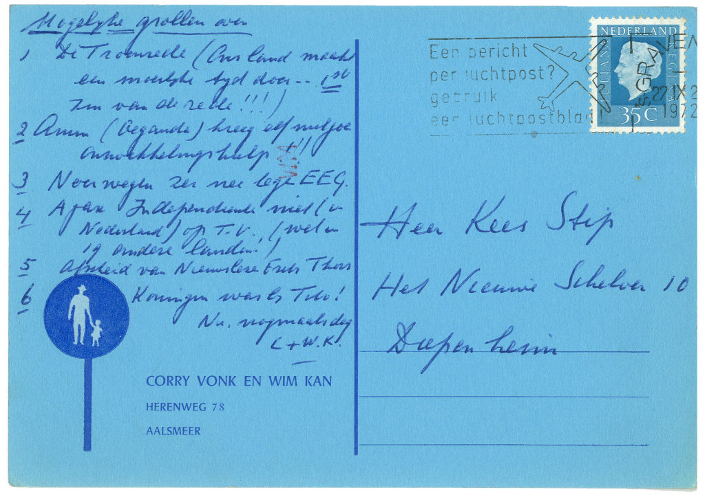 In 1936 had Wim Kan samen met zijn vrouw Corry Vonk het ABC-cabaret opgericht. Na de oorlog had hij een toenemende behoefte aan tekstleveranciers die hem oneliners konden leveren voor zijn politieke conferences. Die gingen een steeds belangrijker plaats innemen in de programma’s die hij bracht. Een van de ‘grappenmakers’ die hem van materiaal voorzagen, was Kees Stip, zoals blijkt uit de meer dan veertig aan Stip geschreven brieven, brief- en ansichtkaarten, aanwezig in de collectie van het Literatuurmuseum.