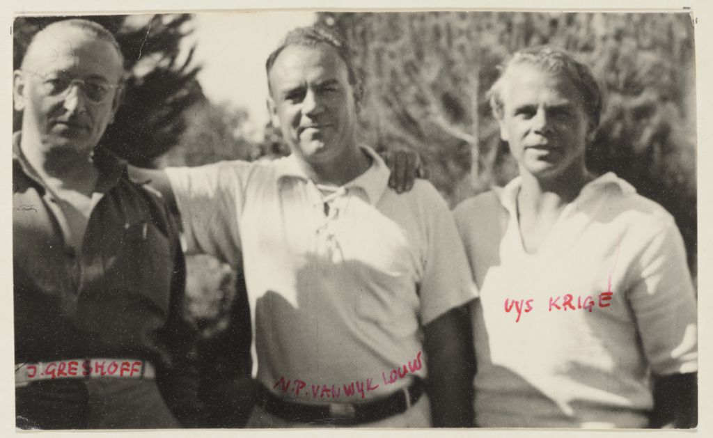 Eronder staan enkele persoonlijke gegevens van de Zuid-Afrikaan Uys Krige, onder meer zijn beroep: warcorrespondent. Maar Uys Krige (1910-1987) was ook een begenadigd dichter en schrijver. De betreffende briefkaart, waarop geen jaartal staat vermeld, is gericht aan de Nederlandse dichter Jan Greshoff. In kleine aaneengesloten letters schrijft Krige hem:
