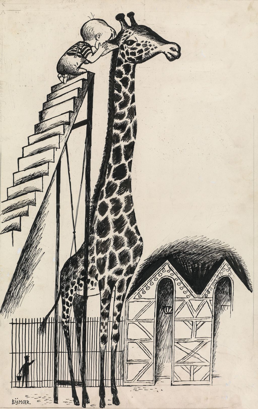 Uiteraard was het Wim Bijmoer die het ventje met zijn trap voor het eerst illustreerde in Het Parool, waarin het versje op 3 juni 1950 verscheen. Bijmoer tekende zijn Dikkertje met vette arceerlijnen op een enorme trap, geflankeerd door een realistische giraf in een klassiek Artis-decor. Elf jaar later volgde een kleurenillustratie voor het omslag van de gelijknamige bundel. Daarvoor gebruikte Bijmoer de steunkleuren geel en rood, waarmee zowel de geel(-gevlekte) giraffenhuid als de rode laarsje (‘voor de regen’) werden benadrukt.
