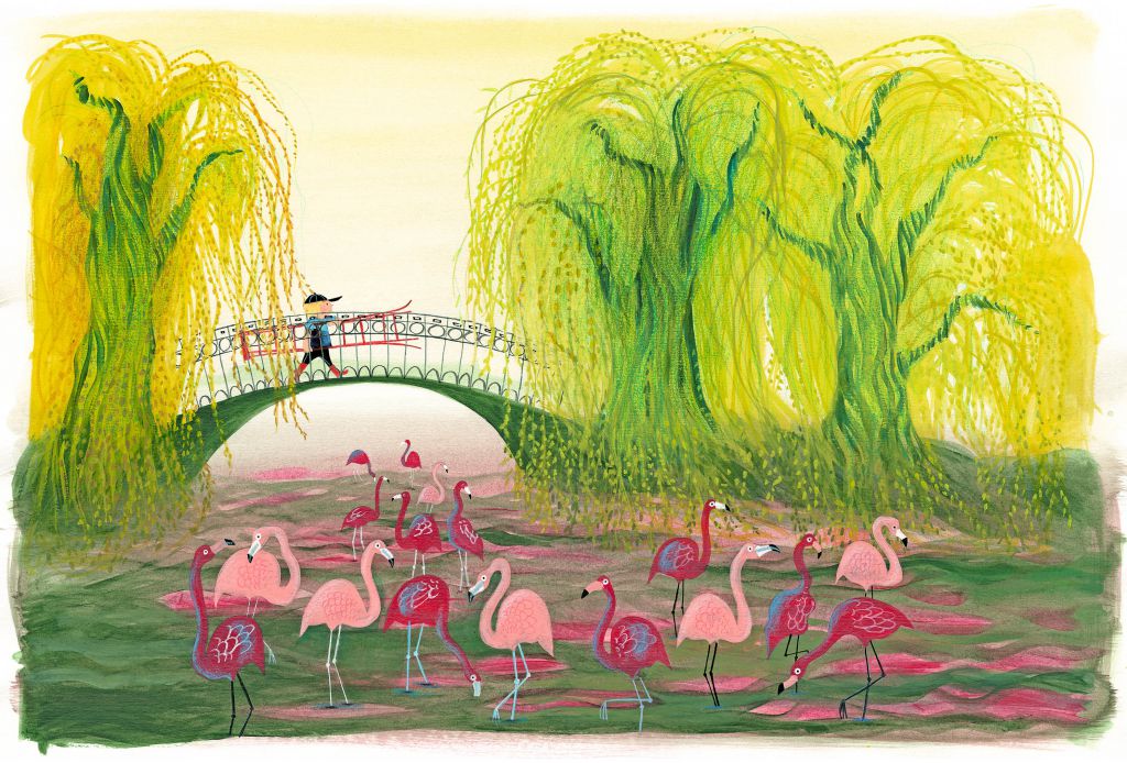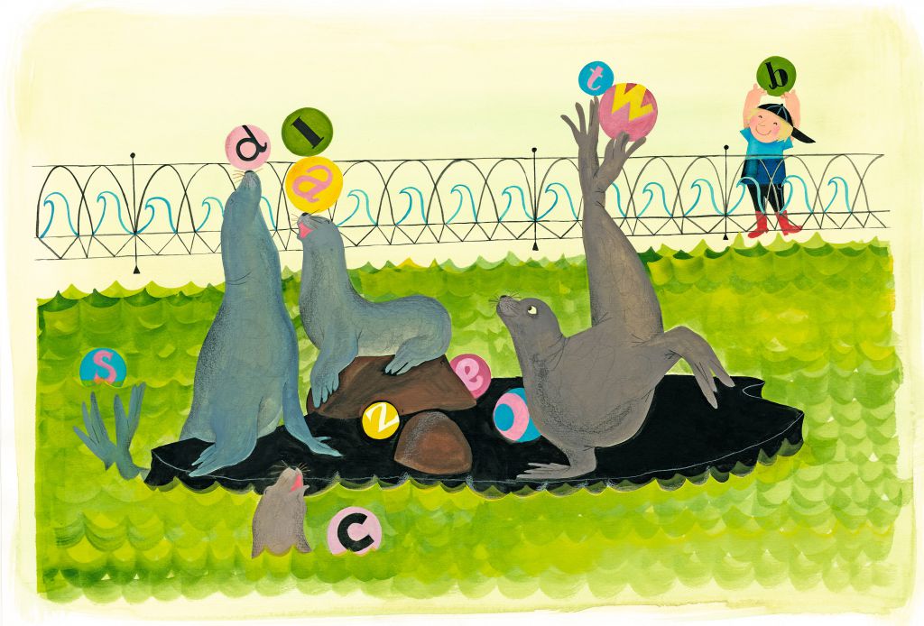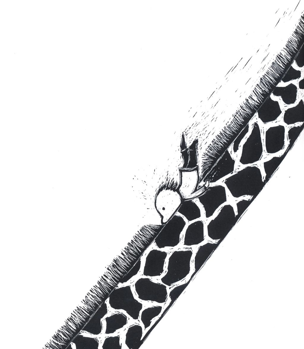 Sieb Posthuma plaatste zijn in het grijs (!) geklede giraf in Een vijver vol inkt (2011) dan weer in volle omvang. Zittend op een grote steen kijkt hij met lichte verwondering naar het parmantige ventje dat vanaf zijn linkervoorpoot zo vrijmoedig tegen hem staat te kletsen – meer minivolwassene dan kleuterkind. Dat Dikkertje al drie letters kan spellen en bijna kan rekenen toonde Posthuma door cijfers en letters vrijelijk in zijn beeld te verwerken, zoals hij bij de door hem bewonderde Amerikaanse tekenaar Saul Steinberg had gezien.