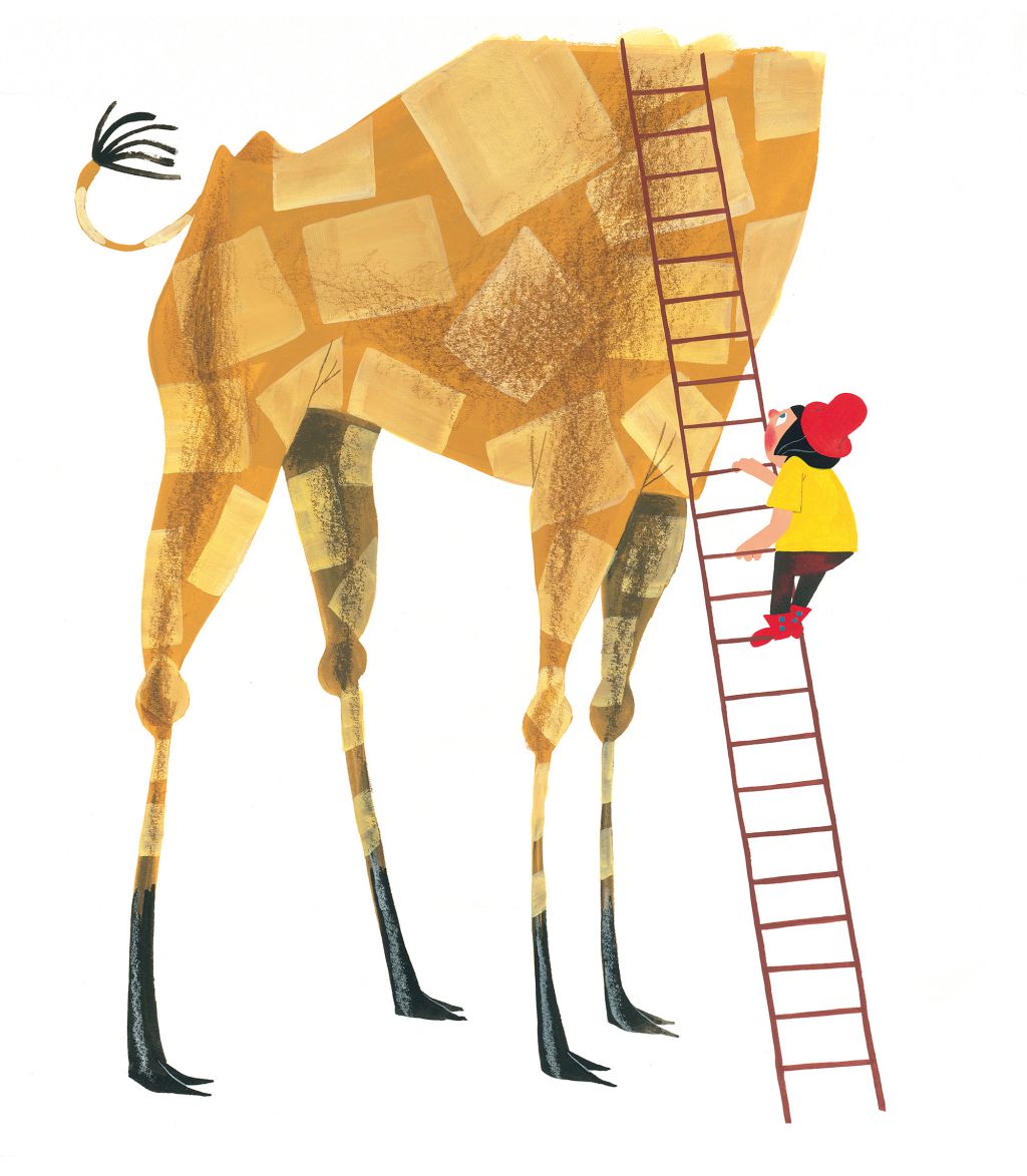 Een jaar later presenteerde Noëlle Smit haar eerste interpretatie van het versje in Ik sta paf!. Verdeeld over twee spreads schiep ze met gouache een giraf die te groot is voor de pagina’s en waarvan consequent een deel ontbreekt. Haar Dikkertje is een ventje op een eindeloze ladder die tot in de wolken lijkt te reiken. Zijn rode wangen wekken de indruk dat hij danig door de hoogte is geïmponeerd.