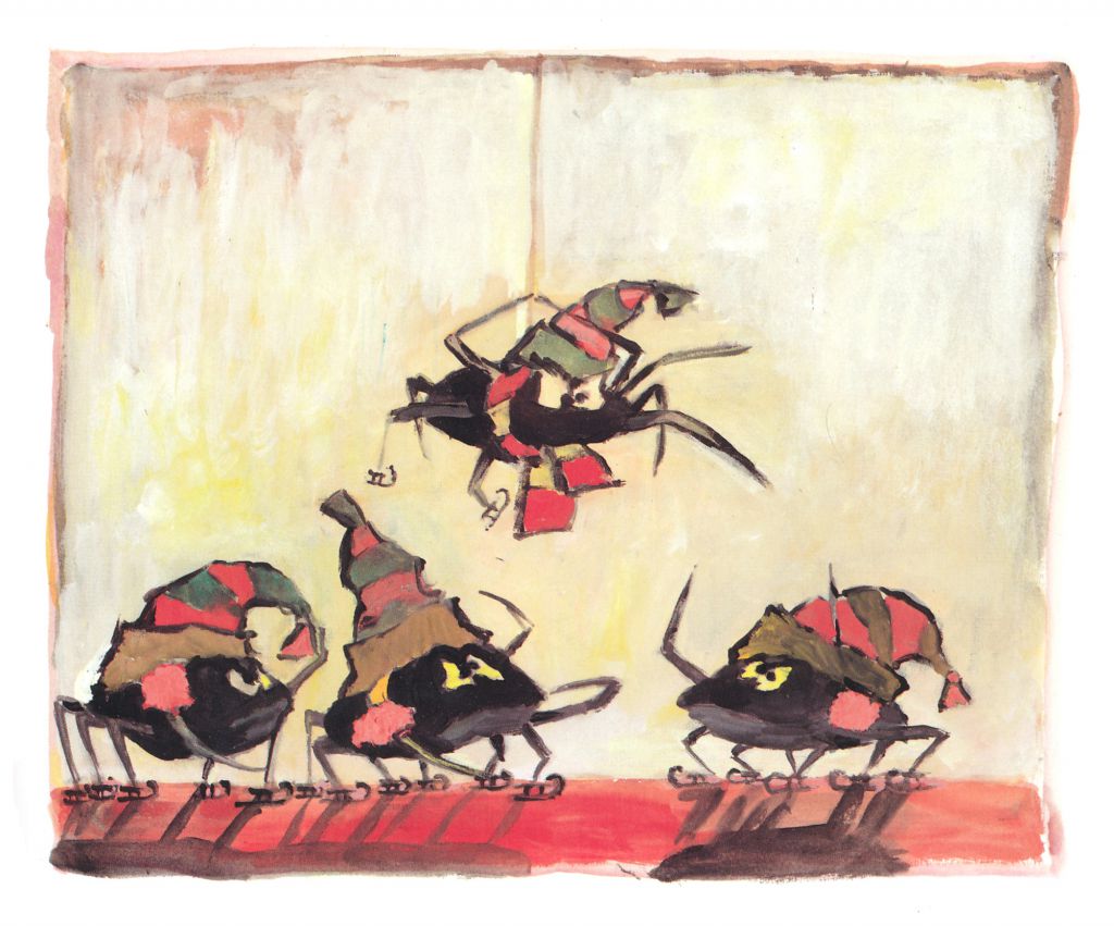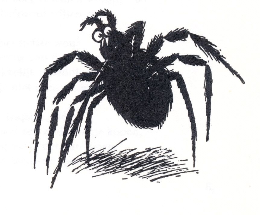 en van de weinige versjes van Schmidt dat niet goed afloopt, is ‘Sebastiaan’. De spin met zijn innerlijke drang tot het weven van een web eindigt dood en opgeveegd. Wim Bijmoer kraste hem in 1951 met een paar robuuste halen op papier en schiep daarmee een iconisch beeld: een donkere vlek op kromme poten. Harrie Geelen volgde 44 jaar later met zijn schilderachtige palet een andere koers en liet de winter waarin het vers zich afspeelt een prominente rol spelen door het spinnengezelschap te tooien met kleurige mutsen en Friese doorlopers.