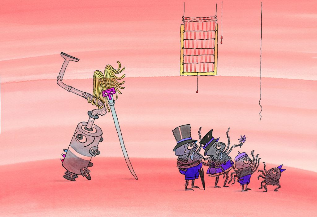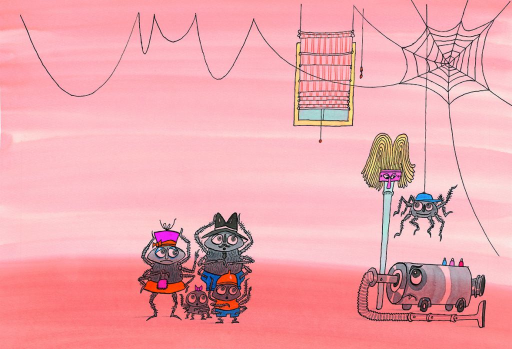 Noëlle Smit hield het in Ik sta paf! (2012) sober en maakte een minimalistische schildering met gloomy onderwaterblauwe gordijnen waarlangs een nietig spinnetje met ogen als lampionnetjes afdaalt, zijn ondergang tegemoet, terwijl Posthuma in Een vijver vol inkt (2011) niet alleen de spinnenfamilie personificeerde en in de kleren hees, maar ook de ‘moordwapens’ zwabber en stofzuiger een gezicht gaf. In hun blikken niets dan zwijgende afkeuring bij Sebastiaans onaangekondigde bezoek aan hun zindelijk huis. Op de eindplaat, na de omineuze ‘pauze’, maakt het tweetal dan weer een frivool dansje (hoera, hij is dood!) terwijl een in rouw gehulde spinnenfamilie omfloerst staart naar de draad die nu leeg en doelloos omlaag bungelt.
