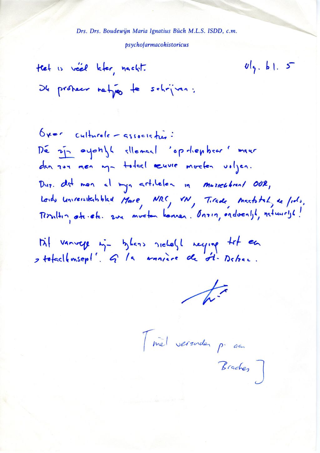 Dat deed hij vier jaar later ook niet toen hij opnieuw een aantal keer ‘Het Zonneke’ in Boxtel noemde (overigens heette de vakantiekolonie ‘Sint Antonius’). Kennelijk sprak hij in deze periode zo vaak over het verblijf dat een vriendin voorstelde om er met hem naartoe terug te gaan. In mei 1975 reden ze in haar deux-chevaux naar Boxtel: onderweg was Büch nog vrolijk, maar zodra ze het terrein opliepen werd hij stil. Toen ze rond het huis liepen, barstte hij in huilen uit. Wat hij die middag vertelde, schreef hij de volgende dag in een pagina’s lange brief aan Harry Prick. De brief lijkt eerder de aanzet tot een roman dan een beschrijving van een jeugdherinnering.