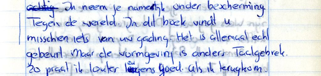 Het is allemaal echt gebeurt. [sic] Maar de vormgeving is anders. Taalgebrek. Zo praat ik louter leugens goed.