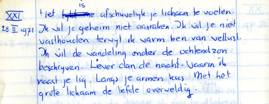 Hoewel deze jongens een steeds prominentere rol in zijn dagboeken gaan spelen, lijken ze toch meer op personages in een tragisch verhaal dan op een werkelijke bron van verlangen. Doorhalingen en stelligere herformuleringen duiden erop dat deze passages vooral een literair experiment waren: