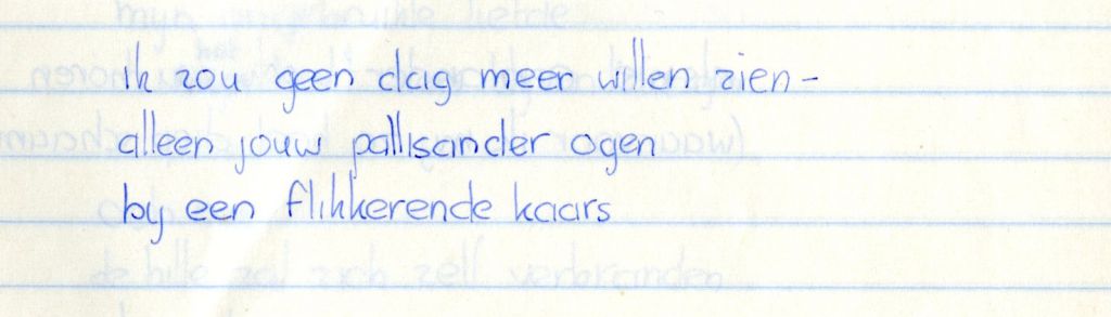 Hoezeer deze passages constructies zijn, blijkt ook wel als Büchs dagboekaantekeningen worden vergeleken met zijn dagelijkse leven. Uit interviews en persoonlijke archieven van vrienden blijkt dat de onmogelijke liefde waar hij in deze periode mee worstelde geen kleine jongen is, maar een jonge vrouw van zijn eigen leeftijd: Willemijn de Jong, die hij een paar jaar eerder had leren kennen als souffleuse van een schooltoneelstuk. Hij was sindsdien verliefd geweest op het meisje met haar ‘pallisander [sic] ogen’, zoals hij haar omschreef in een gedicht (gedateerd ‘15-7-1966’):