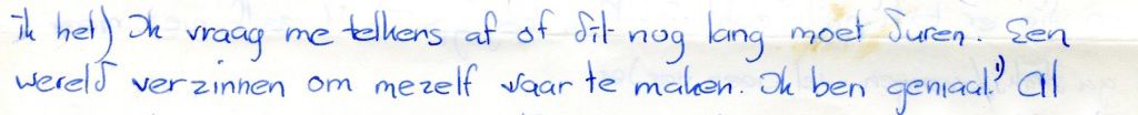 Ik vraag me telkens af of dit nog lang moet duren. Een wereld verzinnen om mezelf waar te maken.