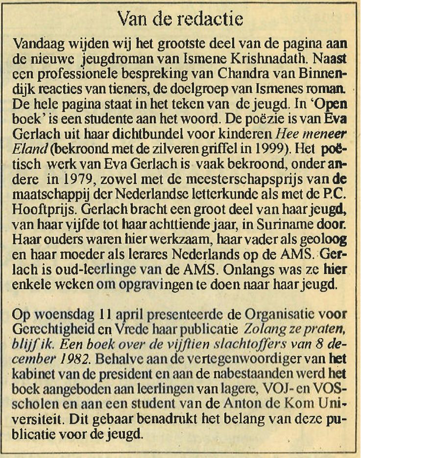 Redacteur Chandra van Binnendijk schreef in haar recensie dat voor deze doelgroep van 11 tot 15-jarigen niet veel verscheen, zeker in Suriname niet. Dat het boek zo nadrukkelijk Surinaams is sprak haar aan: ‘De schrijfster heeft op onnadrukkelijke manier veel Surinaamse elementen in haar verhaal verweven, waardoor het onmiskenbaar alles van dit land ademt.’ De Ware Tijd vroeg ook de doelgroep om een oordeel, en dat resulteerde in sympathieke beschouwingen op schoolkrantniveau. De dertienjarige Joel had een beetje moeite om in het verhaal te komen, en de vijftienjarige Roy (‘in Nederland’) had het nog niet uit maar vond het ‘héél spannend’.