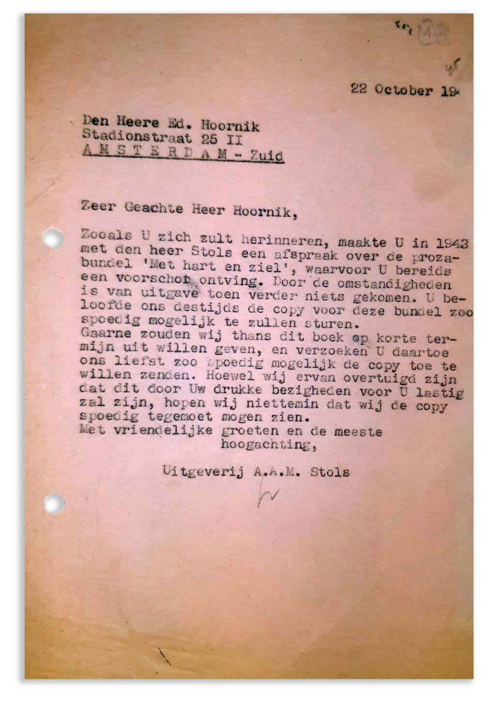 Simon Vestdijk had tijdens de oorlog kunnen doorwerken en hij was dan ook gewoon weer blijmoedig aan de slag met een nieuwe roman. Vrijwel direct na de oorlog stuurt hij een kaartje aan schrijver en verzetsman Johan van der Woude waarin hij laat weten ‘dat wij het er goed hebben afgebracht en nu als ware bevrijden van de nieuwe toestand genieten. Laat eens hooren hoe jullie het maakt!’ Verder gaat het over nieuwe boekplannen en heruitgaven. Kort na de bevrijding begon hij aan zijn roman Pastorale 1943 en half juli 1945 heeft hij al een lange vragenlijst voor Van der Woude over het ‘tijdsbeeld’ in zijn oorlogsboek.