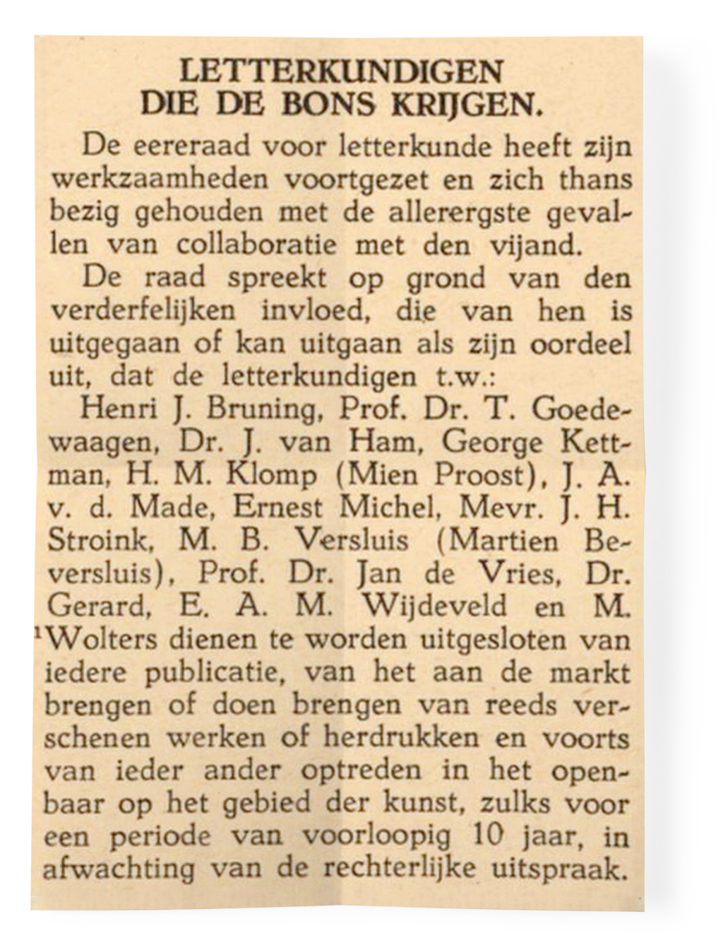Het gaat te ver om te zeggen dat hij tussen hoop en vrees leeft, zoals Henri Bruning of andere schrijvers die ernstig fout waren geweest. En hij is ook niet strijdbaar en optimistisch, zoals Vestdijk of Van Duinkerken, die zo snel mogelijk weer aan de slag gingen. Maar Goddard had gelijk gekregen toen hij Van Oudshoorn waarschuwde dat hij ook op belangstelling van deze ‘heren’ kon rekenen: in februari 1946 krijgt Van Oudshoorn het verzoek om te getuigen voor de Eereraad.
