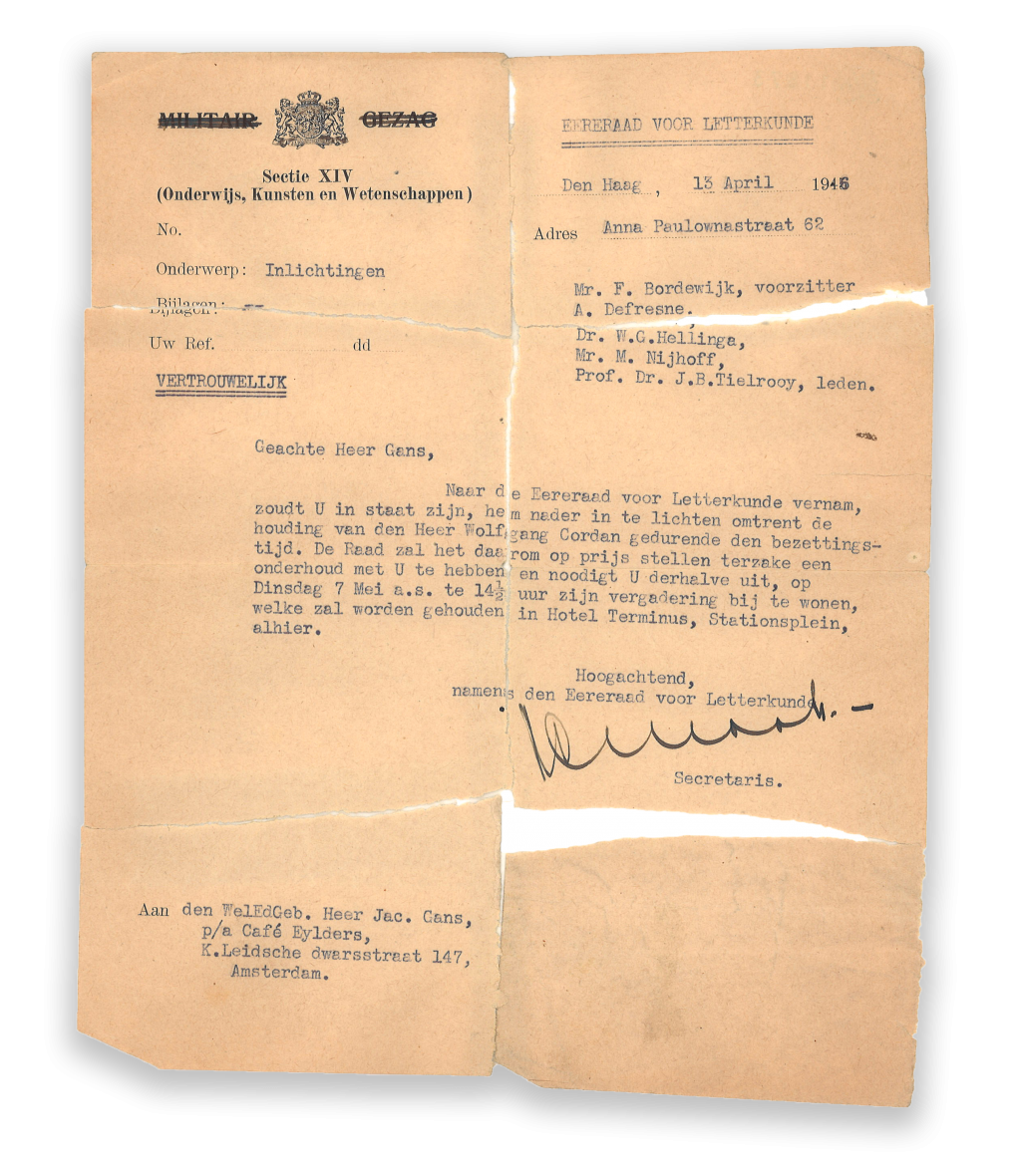 Wanneer de Eereraad zijn licht gaat opsteken in Nederlandse literaire kringen, wordt men ook niet veel wijzer. En niet iedereen wil graag praten. Wanneer Jacques Gans het verzoek krijgt om te komen praten over Wolfgang Cordan, scheurt hij zijn oproep in stukken.