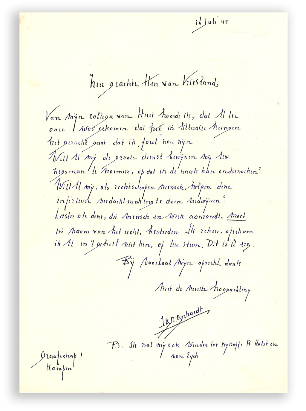 Ondertussen zaten er tussen die ‘spaanders’ natuurlijk niet alleen maar verontwaardigde auteurs die hun eigen verleden wilden verloochenen. Er waren ook schrijvers die niet wisten wat hen overkwam en zich met recht zorgen maakten. De paniek is voelbaar in een brief die Ida Gerhardt in juli 1945 aan Victor van Vriesland schrijft: