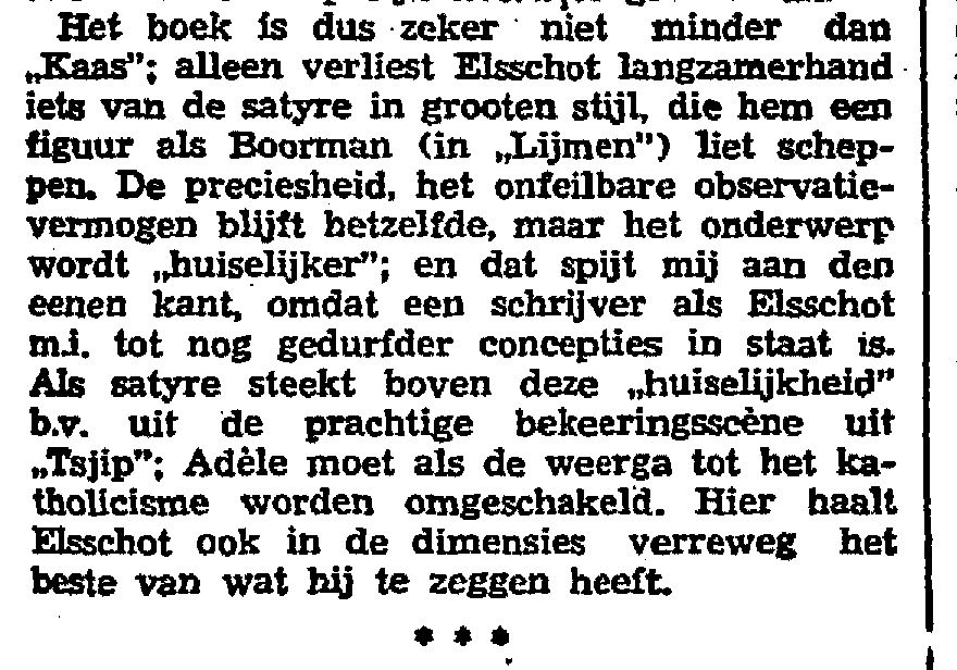 Had Ter Braak zich over Kaas nog op de vlakte gehouden, bij Elsschots volgende boek-zonder-inhoud, Tsjip, steekt hij zijn teleurstelling niet onder stoelen of banken. Hij verwacht van Elsschot ‘meer ruimte, meer horizon’: