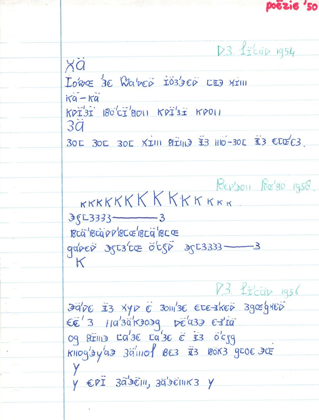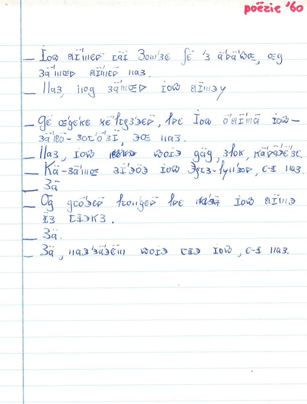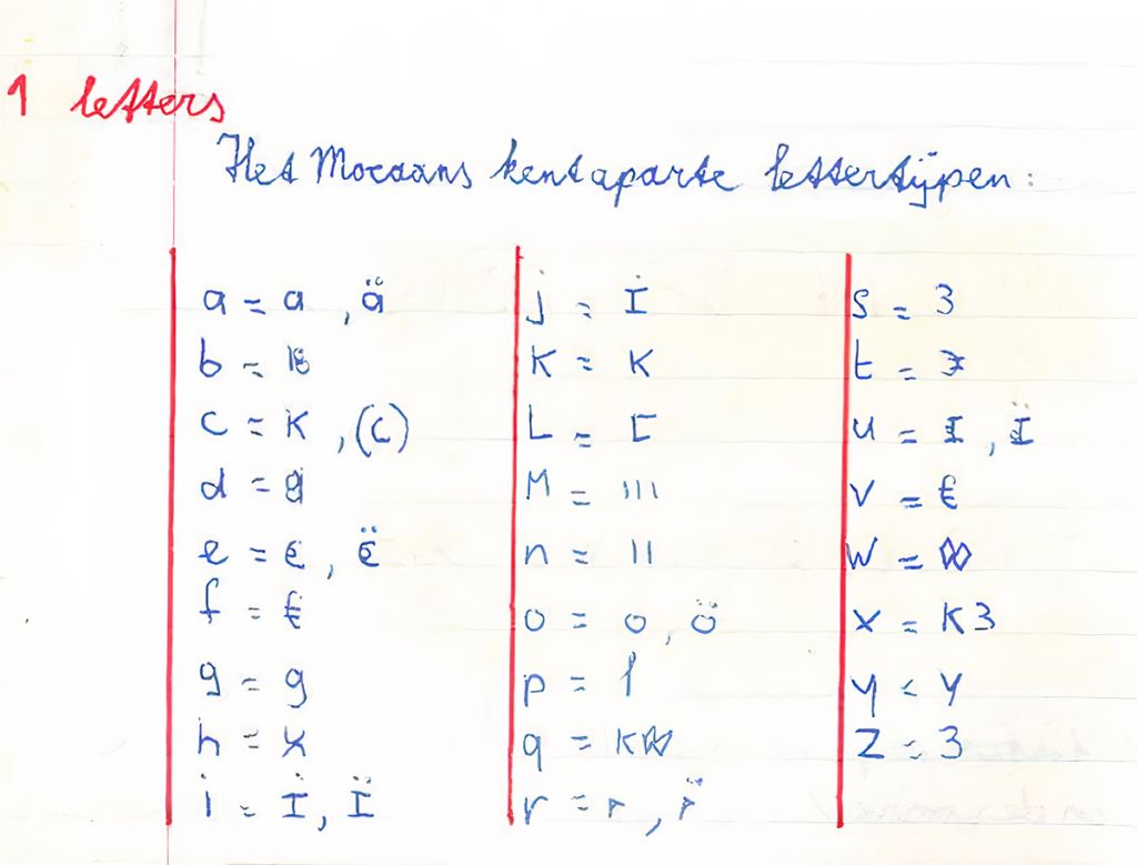 Het verhaal van de taal, zoals Pfeijffer het vertelt aan het Literatuurmuseum, begon zo rond zijn twaalfde, dertiende, toen hij op de middelbare school Grieks kreeg en zich ging interesseren voor afwijkende alfabetten. Eerst kwam er een apart Mocaans schrift, een eigen alfabet – rechttoe rechtaan, maar dat beviel niet, dat was te simpel. ‘Dan heb je geen echte taal. En ik wilde wél echt een taal verzinnen.’ Er moesten nieuwe woorden komen, en vooral: een grammatica.