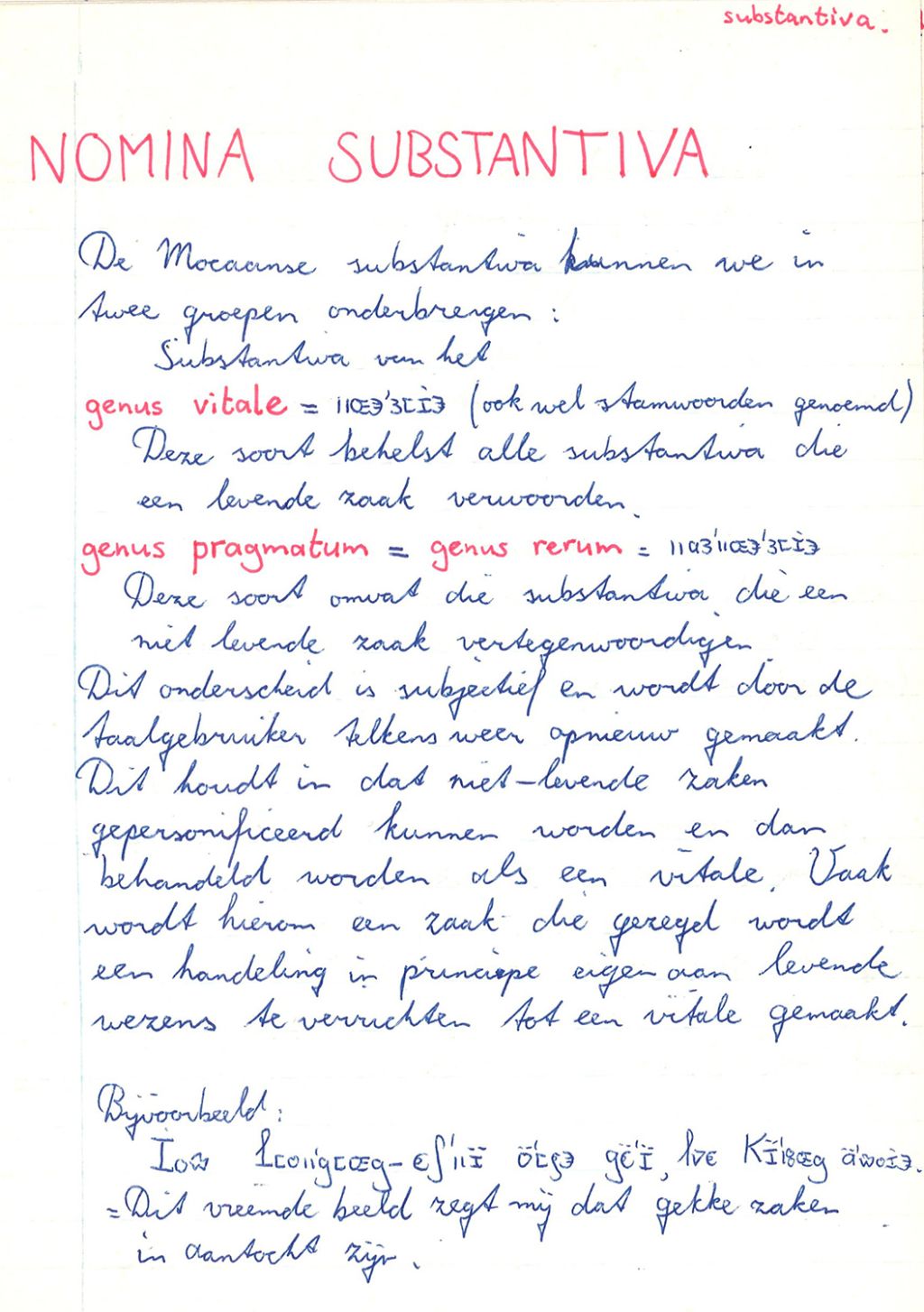 ‘Ik herinner het mij nog dat het destijds een van mijn grootste frustraties was dat ik nooit Mocaans kon horen. Ik kon het wel tegen mijzelf spreken of desnoods opnemen, maar dan wist ik altijd wat ik gezegd had, waardoor het niet nodig was om de taal ook echt te verstaan. Ik fantaseerde over het moment, in de verre toekomst, dat ik zou zijn vergeten wat ik had gezegd en dat ik daadwerkelijk moest luisteren naar iemand die Mocaans tegen mij sprak. Dat magische moment is vandaag.’