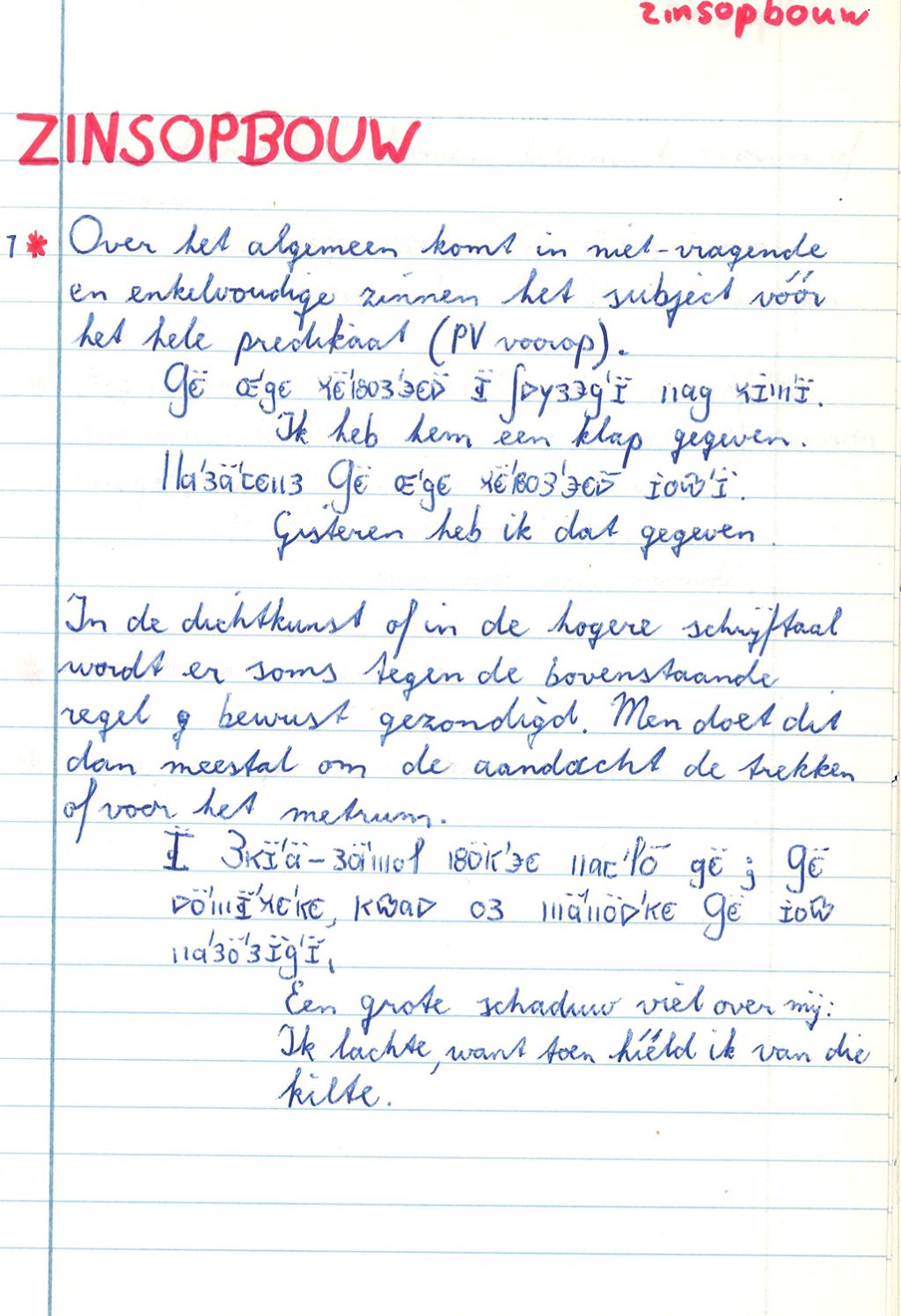 ‘Toen ik daarmee begon was ik heel jong en kende ik nog niet zo veel van andere talen. Dus het zal ook opvallen dat het fundament van de grammatica erg lijkt op het Nederlands. Bijvoorbeeld de werkwoordsvormen die voor de tweede en derde persoon hetzelfde zijn, en de meervoudsvormen, die ook allemaal hetzelfde zijn. Pas een paar jaar later begreep ik dat ik dat allemaal veel exotischer had kunnen maken. Maar ja, toen had ik de basis al, en die kon ik niet meer veranderen.’