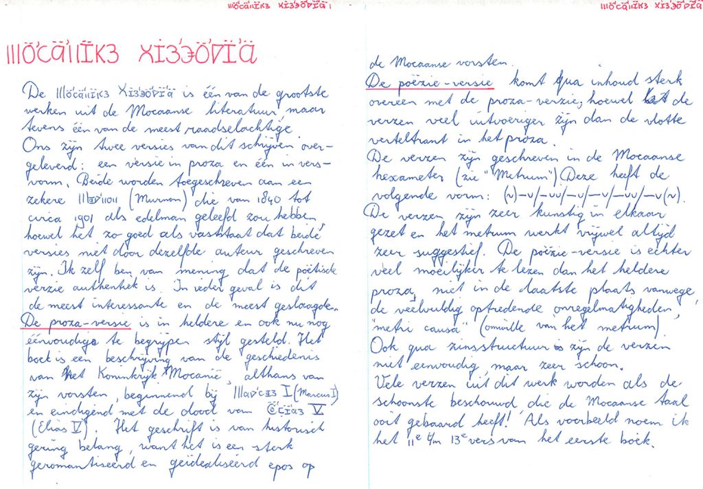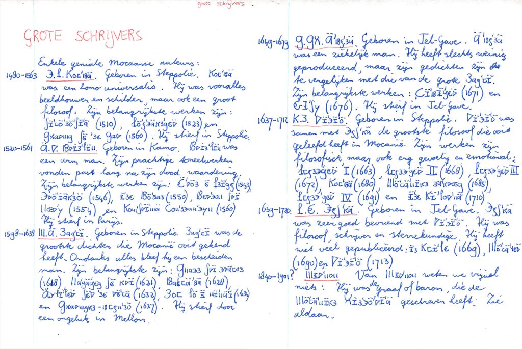 Het Mocaans was wat eenvoudiger dan de bedoeling was geweest. Misschien creëerde hij daarom een geschiedenis waarin ‘Oud-Mocaans’ werd gevonden, en waarbij de verschillende eilanden ook nog eigen dialecten hadden. Een organisch geheel dus.
