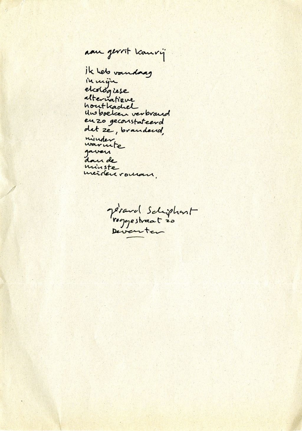 Ergens in Oost-Nederland zat een lezer zich te ergeren, en stuurde de volgende brief naar Vrij Nederland, getypografeerd als een gedicht: ‘ik heb vandaag / in mijn / ekologische / alternatieve / houtkachel / uw boeken verbrand / en zo geconstateerd / dat ze, brandend, / minder / warmte / gaven / dan de / minste / meidenroman.’