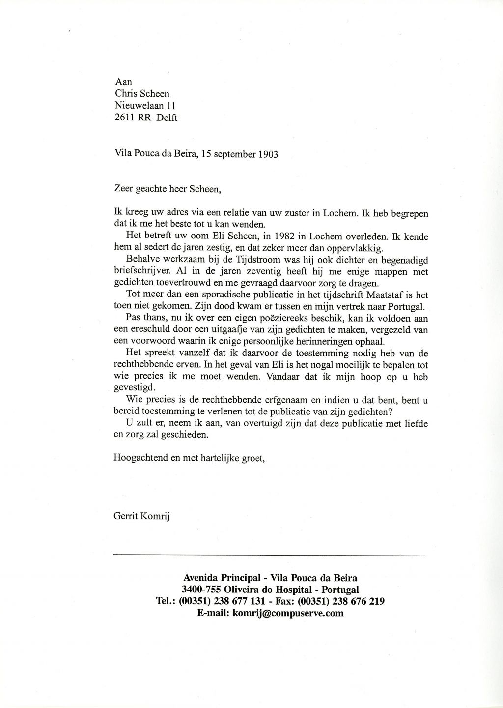Pas thans, nu ik over een eigen poëziereeks beschik, kan ik voldoen aan een ereschuld door een uitgaafje van zijn gedichten te maken, vergezeld van een voorwoord waarin ik enige persoonlijke herinneringen ophaal. […] U zult er, neem ik aan, van overtuigd zijn dat deze publicatie met liefde en zorg zal geschieden.
