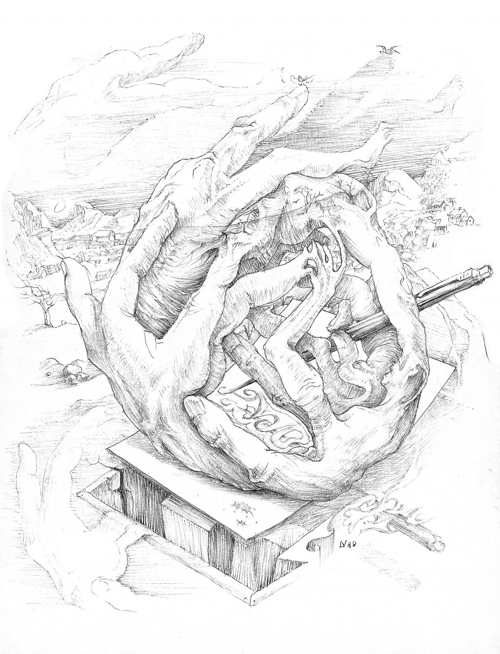 Hij tekent in die periode graag met potlood: ‘want potlood is zo ontspannend, vooral als je er zachte rondingen mee schaduwt, dus ik maakte blote mensen die in ronde schelpen overgingen en handen die iets anders werden, maar ook een stuk boombast waar het wemelde van de kleine naakten.’ (Warm, 1994)