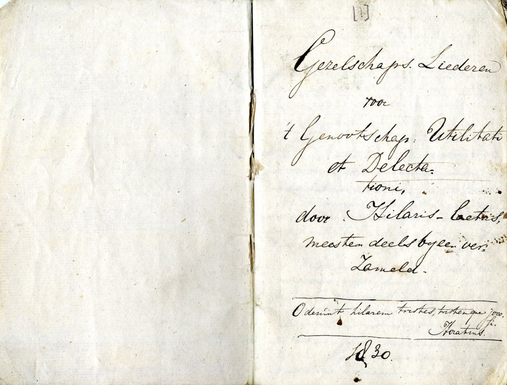 Zijn literaire bezieling kan de jonge Beets eveneens uitleven in het gezelschap Utilitati et Delectationi (Nut en Vermaak). Onder het pseudoniem Hilaris Laetus (Blijgeestige) stelt hij hiervoor in 1830 een handgeschreven bundel Gezelschaps-Liederen samen onder het aan Horatius ontleende motto ‘Oderunt hilarem tristes, tristemque jocosi’ (De somberen haten de vrolijken en de vrolijken de somberen).