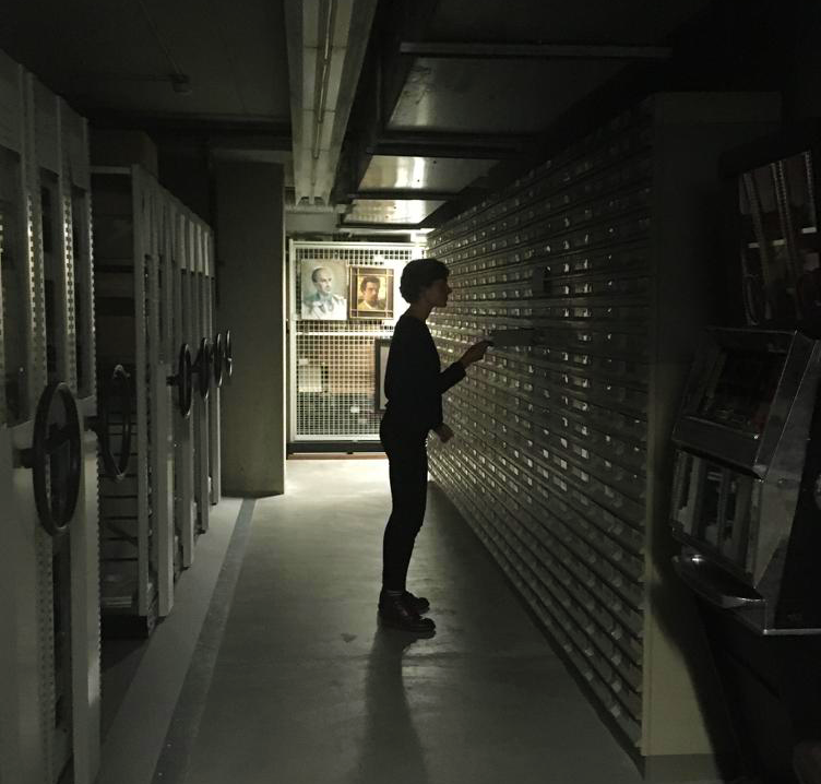 Voor de meeste onderzoekers blijft dit een mysterie, zij zijn voor het inzien van stukken aangewezen op de studiezaal. Slechts enkelingen is het gegund om zelf af te dalen in het archief. Met een speciale lift zak je af naar – inderdaad – een donkere bunker waarin je bij binnenkomst nog net de contouren van lange rijen kasten kunt onderscheiden. Als je het licht aandoet duurt het even voordat de tl-buizen zijn opgewarmd. Na een paar keer knipperen springen ze aan en verlichten ze zorgvuldig opgestapelde archiefdozen en uitgestrekte rijen beweegbare kasten.