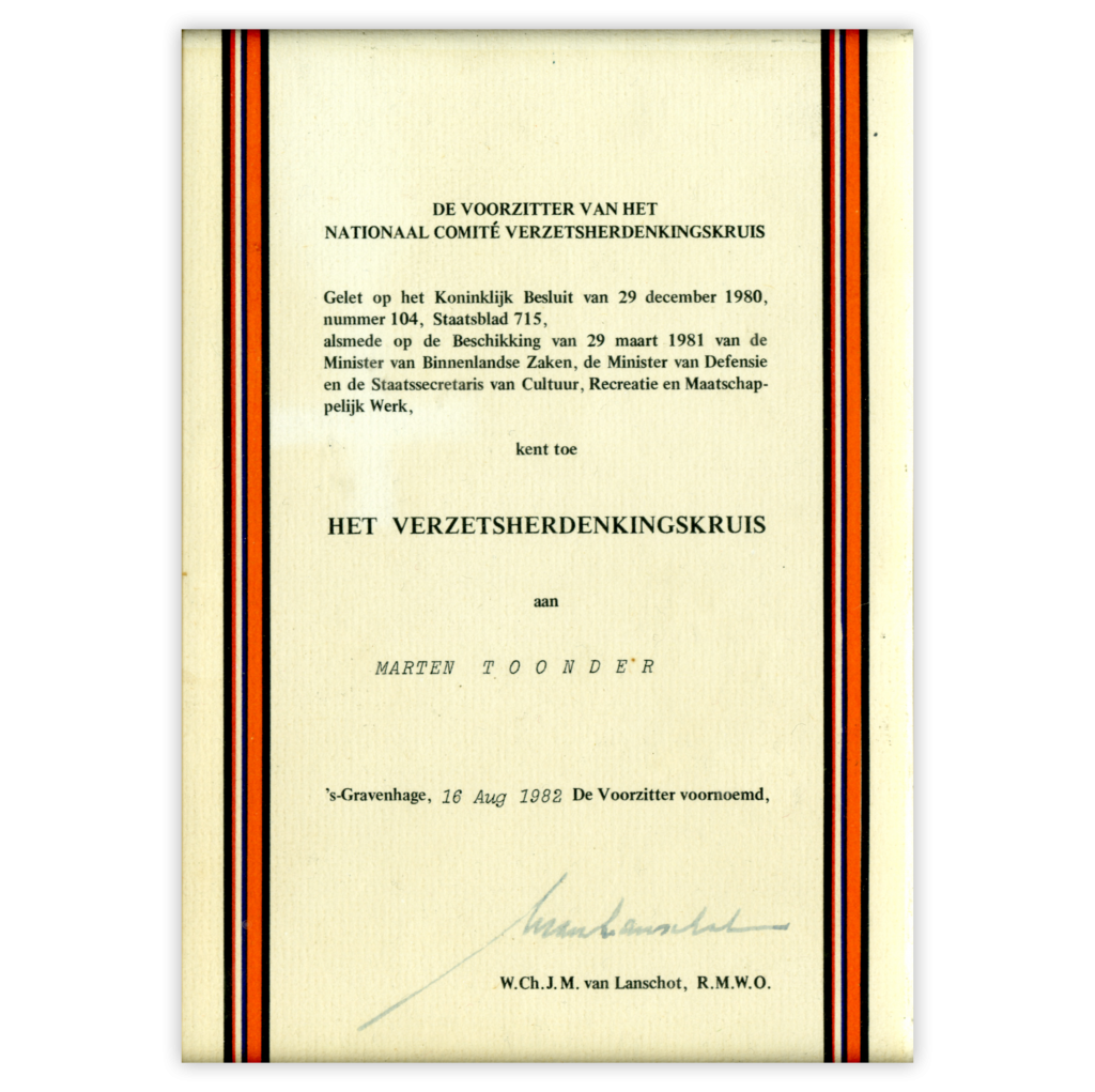 In 1982 ontving Marten Toonder voor zijn bijdrage aan het verzet het Verzetsherdenkingskruis.