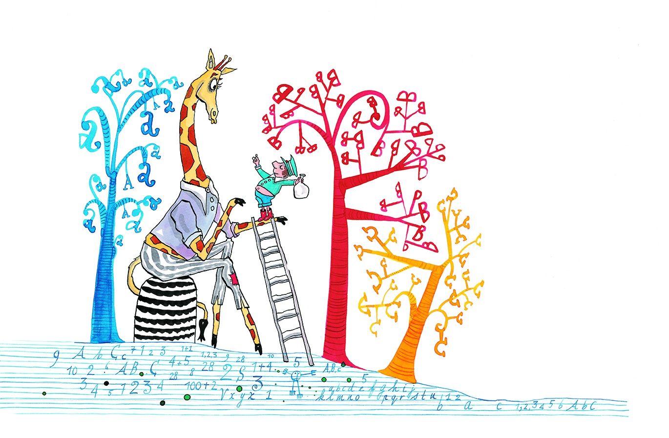 Sieb Posthuma plaatste zijn in het grijs (!) geklede giraf in Een vijver vol inkt (2011) dan weer in volle omvang. Zittend op een grote steen kijkt hij met lichte verwondering naar het parmantige ventje dat vanaf zijn linkervoorpoot zo vrijmoedig tegen hem staat te kletsen – meer minivolwassene dan kleuterkind. Dat Dikkertje al drie letters kan spellen en bijna kan rekenen toonde Posthuma door cijfers en letters vrijelijk in zijn beeld te verwerken, zoals hij bij de door hem bewonderde Amerikaanse tekenaar Saul Steinberg had gezien.