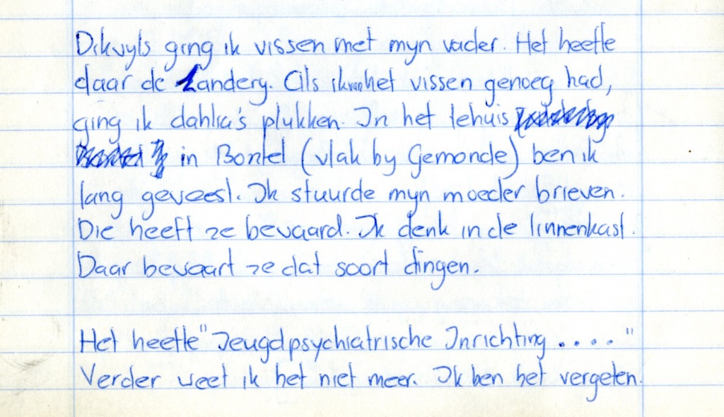 In het tehuis in Boxtel (vlakbij Gemonde) ben ik lang geweest. Ik stuurde mijn moeder brieven. Die heeft ze bewaard. Ik denk in de linnenkast.