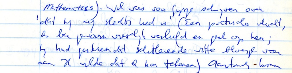 Wil vers voor Gijsje schrijven over ‘dat hij nog slechts lied is’. (Een poetische [sic] vlucht, ik ben gewoon vreselijk verliefd en geil op hem; hij had gisteren dat schitterende witte bloesje weer aan. Ik wilde dat ik kon tekenen)