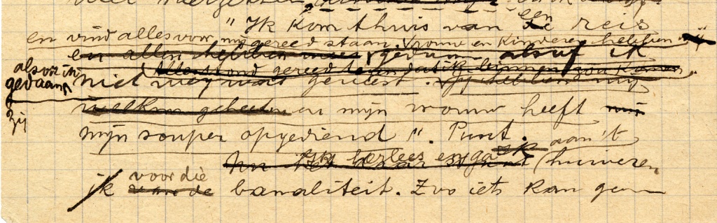 Voor het geval de typoscriptversie dit nog niet voldoende mocht tegenspreken, volgt hier de eerste versie van de passage volgens het handschrift van ‘Achter de Schermen’, met speciale aandacht voor de wederom veelzeggende doorhalingen: