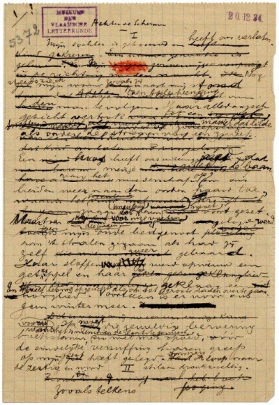 Dit handschrift blijkt meer prijs te geven dan de maskerende auteur zou hebben gewild. Al vanaf de eerste pagina valt op hoeveel Elsschot heeft geschrapt om tot een eerste versie te komen. En dat is vreemd, want als hij het originele manuscript van de ‘Opdracht’ nog bezat, dan hoefde hij de tekst toch maar over te schrijven?