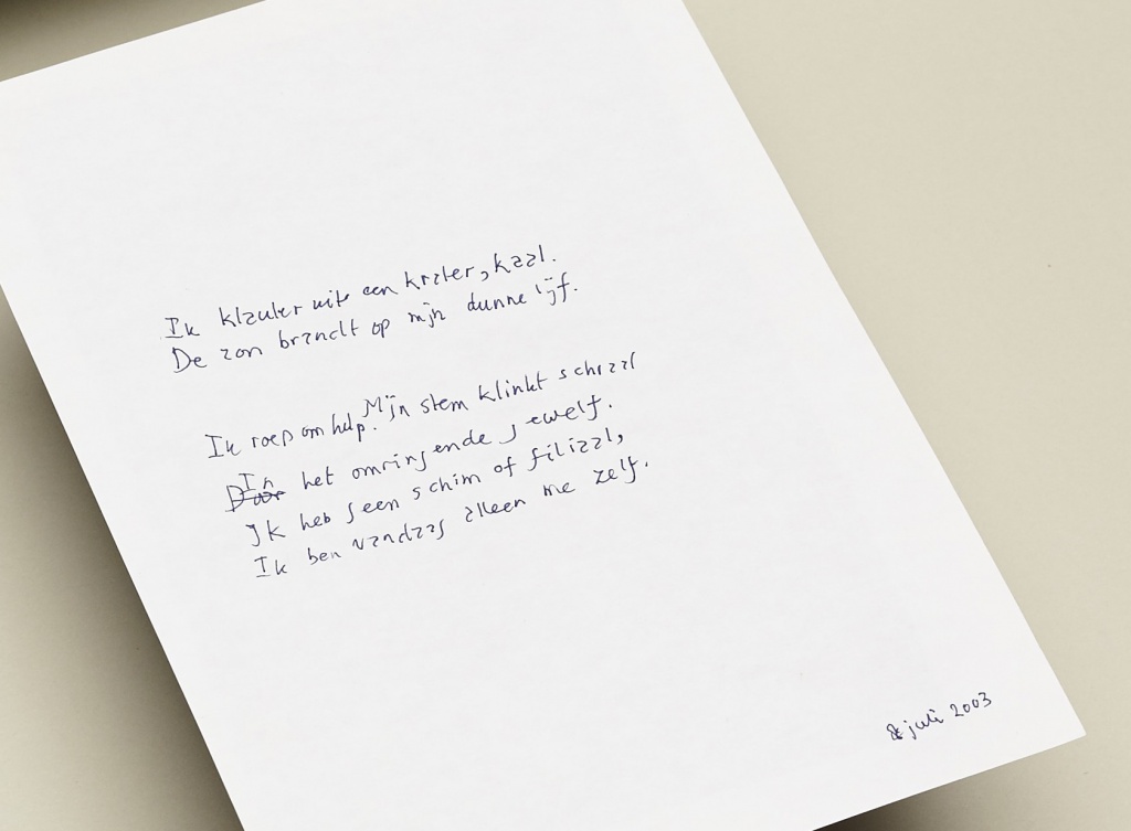 Tussen de correcties voor een latere editie van Alle gedichten tot gisteren is een verdwaald papiertje terechtgekomen. Er staat een klein gedicht op. Titelloos, niet ondertekend, wel gedateerd op 8 juli 2003: