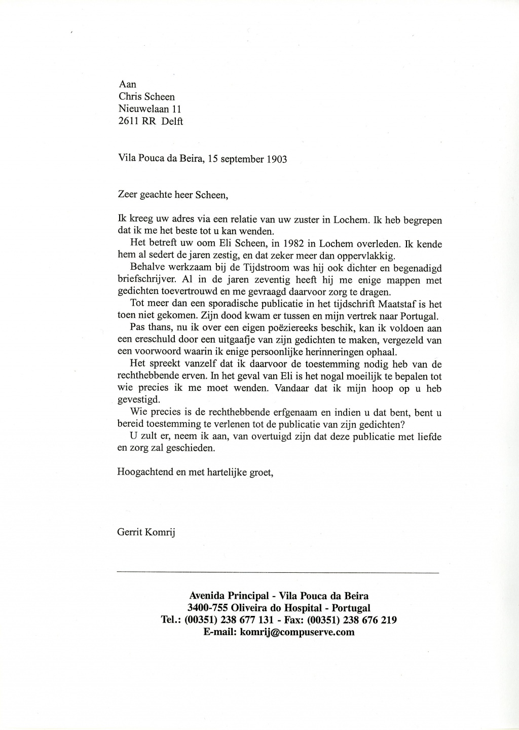 Pas thans, nu ik over een eigen poëziereeks beschik, kan ik voldoen aan een ereschuld door een uitgaafje van zijn gedichten te maken, vergezeld van een voorwoord waarin ik enige persoonlijke herinneringen ophaal. […] U zult er, neem ik aan, van overtuigd zijn dat deze publicatie met liefde en zorg zal geschieden.