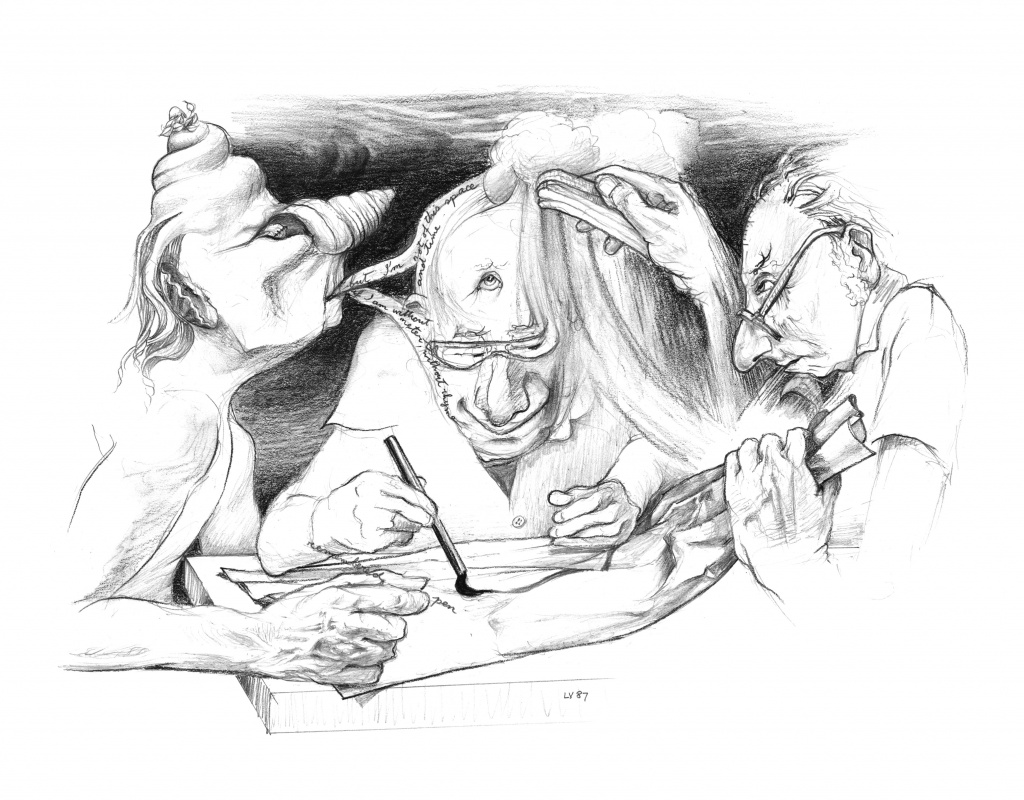 Hij tekent in die periode graag met potlood: ‘want potlood is zo ontspannend, vooral als je er zachte rondingen mee schaduwt, dus ik maakte blote mensen die in ronde schelpen overgingen en handen die iets anders werden, maar ook een stuk boombast waar het wemelde van de kleine naakten.’ (Warm, 1994)