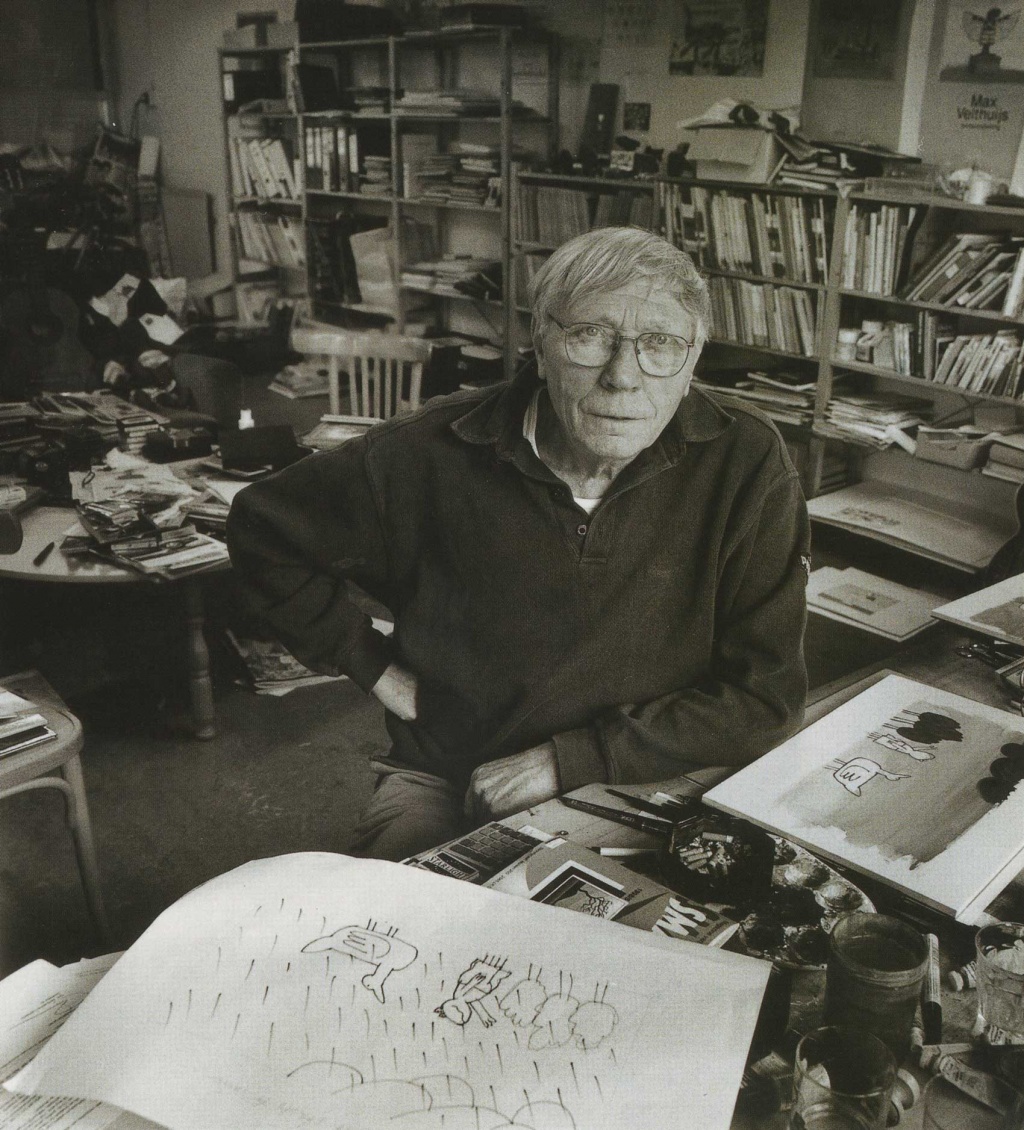 De lage langgerekte ruimte van het voormalige naaiatelier was precies goed. Het was dicht bij huis. Er was water, verwarming én een tuin waar poezen en vogels vrij spel hadden. Vanaf de altijd overvolle werktafel met ingebouwde schaakcomputer, asbakken, papier, potloden, penselen en verfbakjes keek hij uit op een ommuurde stadstuin met uitbundig bloeiende rozen en een abrikozenboom. Achter die muur klonken het kraaien van de haan en het gemekker van de geiten van de aangrenzende kinderboerderij.