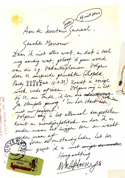 Daar ik niet alles weet, en dat is toch nog aardig wat, geloof ik geen woord van die z.g. vakantieplannen. Volgens door u verspreide geruchten (Leopold Party enz. 16-4-’83) zoudt u vorige week reeds afreizen. Volgens mij is het bij u een bende, ik zou die (onleesbaar gemaakt) willen zien. Ja stempels genoeg! En hoe staat het met uw paspoort?